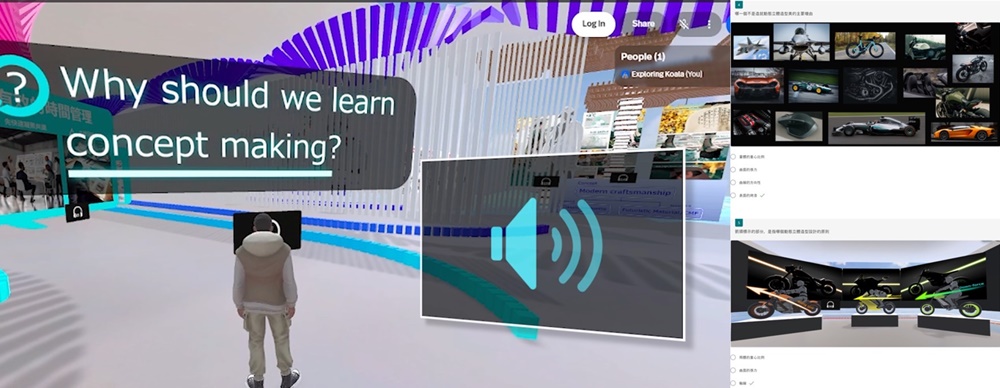 第一階段為分段式線上元宇宙教室互動學習,GK Dynamics 特別為設計營打造專屬的「交通工具設計元宇宙教室」,學生需於每週課前先進入平台完成指定學習進度,課後填寫學習測試問卷。透過此方式的活動設計,為設計營爭取更多業師與學生線上直接互動交流討論設計的時數,學生課後亦能返回平台複習教學內容。