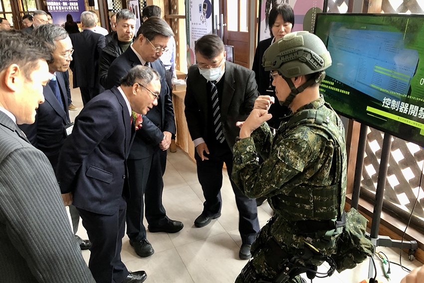 中科院與台大等三校完成聯盟合作備忘錄簽署後,邀請與會貴賓參觀野戰型軍用外骨骼等研發成果。 中科院/提供