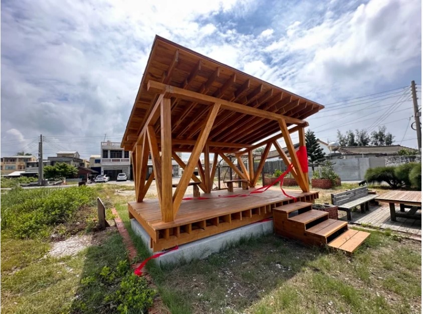 這項「2023年成龍社區低碳木構築空間示範計畫」邀請國內木構建築先驅洪育成擔任設計指導,張潤文為結構顧問,選擇出優秀作品,再由林業保育南投分署支援國產柳杉及闊葉木材,委由福樟公司製材,結合雲科大學生及社區志工共同施工搭建完成,把來自山區的國產材和海岸濕地緊扣一起,象徵國土綠網軸線緊密結合,意義非凡。