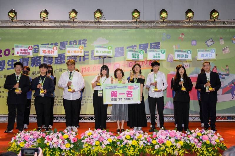 2025年全國技專校院學生實務專題製作競賽暨成果展成績揭曉,教育部技職司長楊玉惠(中)頒獎表揚。(圖由教育部提供)