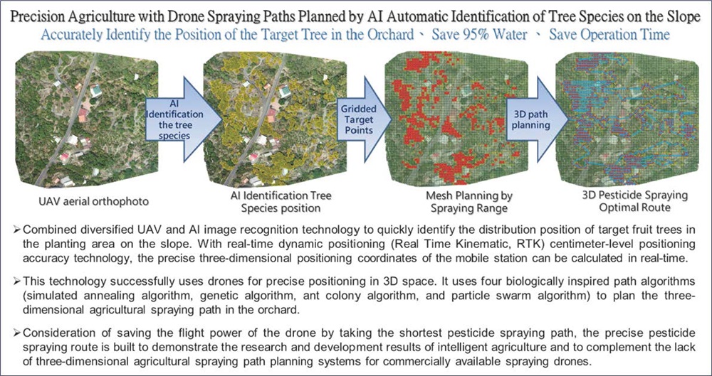 「AI智慧化樹種辨識無人機精準農噴路徑」由電機系教師陳靜茹帶領團隊研發,以無人機搭配高解析度鏡頭,拍攝種植區的正射影像,分析坡地雜種的果樹類別、定位果樹範圍,透過切割網格設立農噴點位,針對目標作物規劃無人機自動農噴路徑,並且利用無人機螺旋槳的風力,將農藥或液肥噴灑至指定點位,可節省95%農業用水,並減少人力與農藥對環境的傷害,此作品也獲得歐盟羅馬尼亞國立學校特別獎。