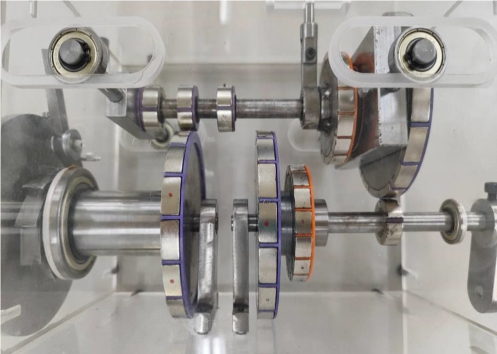 機械工程系吳益彰教授團隊,則是探討以永磁齒輪取代傳統機械齒輪於捲揚機中的應用,具有無噪音非接觸式傳動、安全滑脫機制及維修保養容易等特性。設計方面,選用非共軸磁齒輪構型,並加入棘輪與棘爪機構達到自鎖安全,透過Inventor繪製3D模型,將永磁齒輪捲揚機設計三個檔位:第一檔省力、第二檔省時、第三檔適用於快速吊升小荷重。使用Ansys Maxwell分析三檔位的轉速和扭矩,確定了最佳輸入轉速範圍以避免失步現象產生,結果顯示,第一檔最大扭矩為0.407 N ‧ m,可省力吊升1.728公斤;第二檔輸出扭矩為0.250 N ‧ m,具省時特性,荷重略低於第一檔;第三檔直驅適合小荷重物,輸出扭矩值0.05 N ‧ m,整體設計透過磁性齒輪的磁力滑脫達到過載安全滑脫機制,確保操作安全,此項研發創新技術,勇奪金牌。