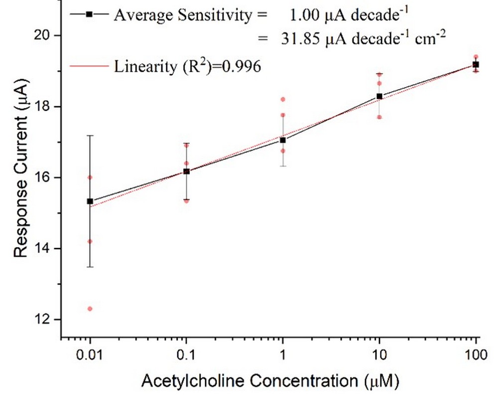 電子工程系賴志賢教授團隊之創新研發技術「基於WO₃ NPs/MoO₃異質接面的雙酵素電流式乙醯膽鹼低檢測限感測器」,提出一種基於三氧化鉬薄膜的電壓式乙醯膽鹼感測器,藉由乙醯膽鹼酵素及膽鹼氧化酵素提高選擇性,並以三氧化鎢奈米粒子提高感測器的感測性能,以循環伏安法量測。乙醯膽鹼為一種神經傳導物質,存在周邊神經系統及中樞神經系統,乙醯膽鹼濃度與多種疾病有關,包括帕金森氏症、阿茲海默症等。因此乙醯膽鹼的檢測變得極為重要。為此我們發明一款乙醯膽鹼監測設備,其平均感測度、線性度及檢測極限,均有良好之性能,亦勇奪金獎。