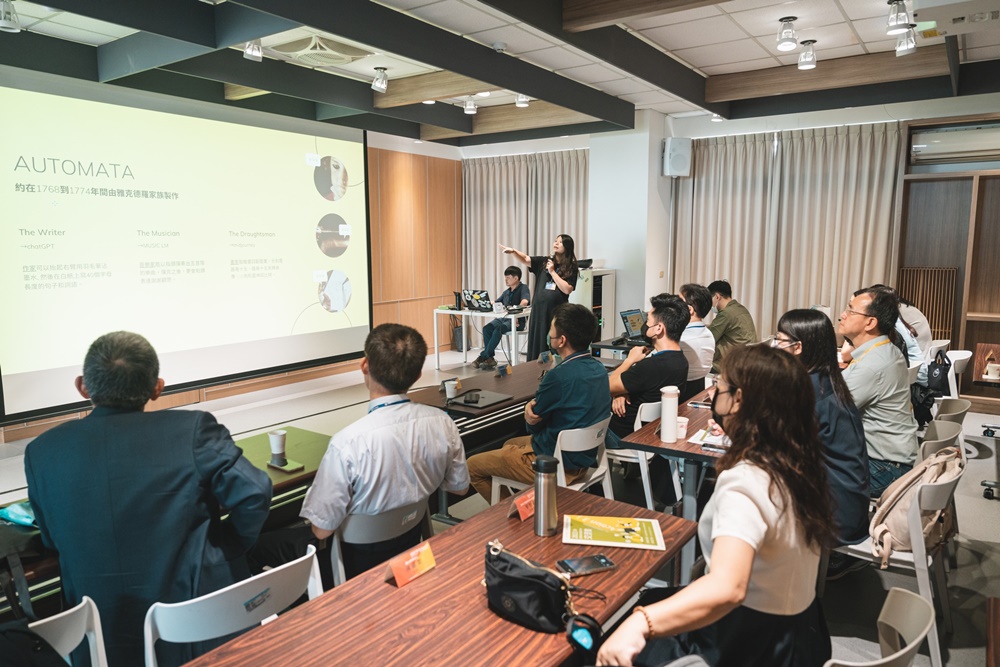 同時,安排各校的課程設計分享與綜合討論,規劃數字媒體系林佳麗老師,分享如何透過AI工具將舊課程程序翻新,與創業管理專業的胡永翔老師,分享如何透過AI進行教學輔助與節儉備課、批改作業的時間。讓各校老師可以分享教學方案與探討,吸取學習不同的課程計劃,激發更多的創新念與翻轉教學的教學案。