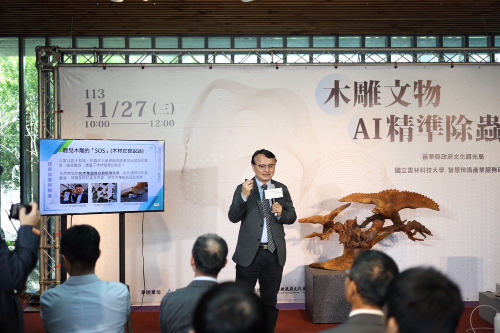 由雲科大智慧辨識產業服務研究中心張傳育教授團隊領導開發的「AI木雕蟲聲自動檢測技術」,精確監聽木材內部微弱的蛀蟲聲音,無需破壞文物即可快速檢測出蛀蟲類型。