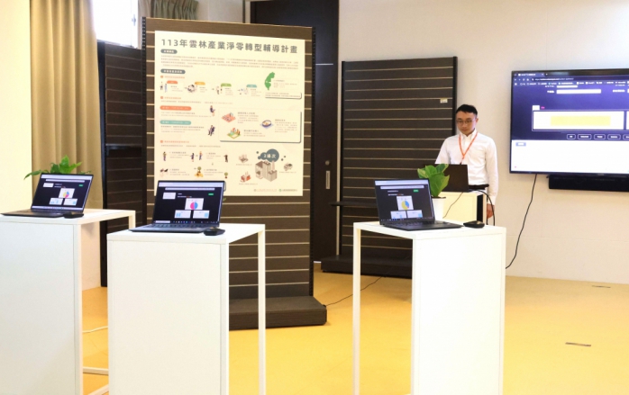 另「產業碳管理區」展示雲科大的雲永續碳盤查雲端平台彙整企業從開發、生產到銷售過程的活動數據,以智慧量化及監測碳排放的方式,為企業量身打造低碳節能策略。