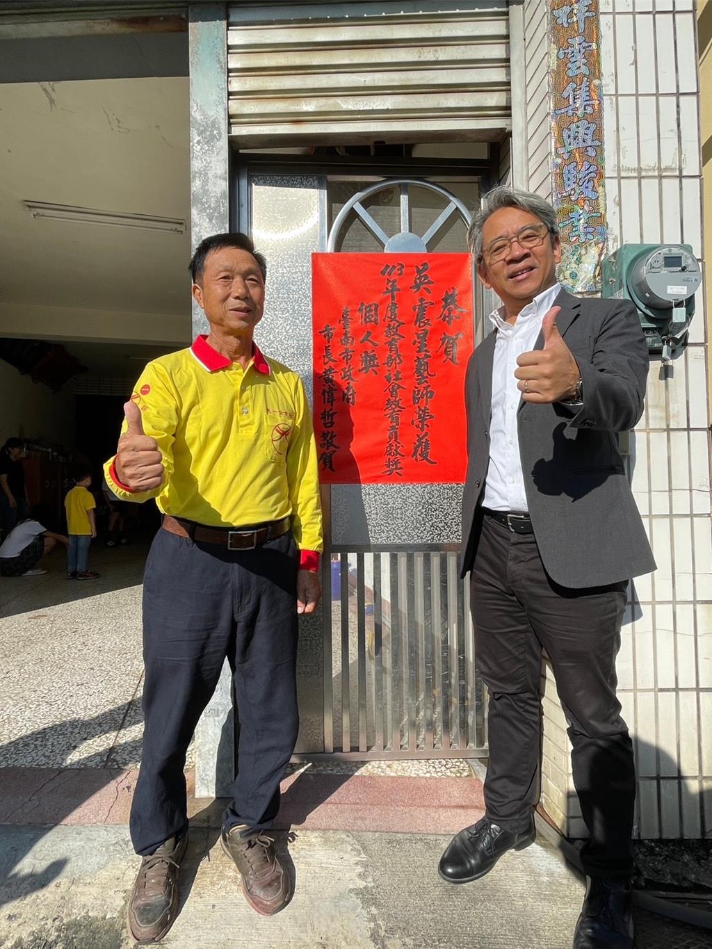 文化局長謝仕淵(右)前往吳震星藝師家張貼紅榜。(文化局提供/曹婷婷台南傳真)