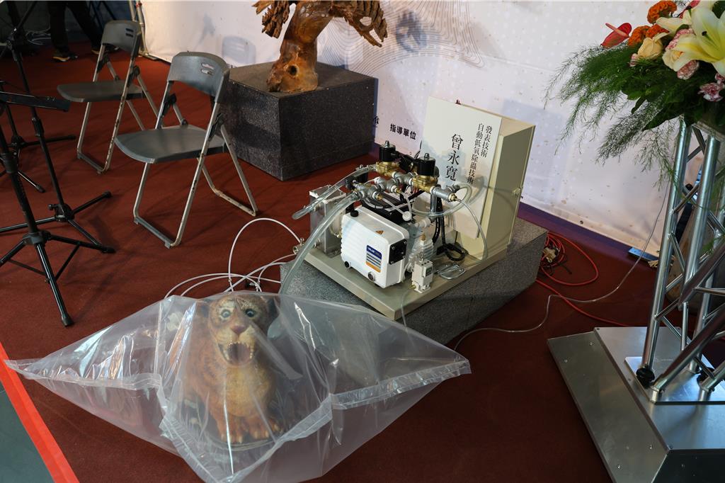 苗栗縣政府文觀局三義木雕博物館是國內最重要木雕藝術品蒐藏中心,與國立雲林科技大學智慧辨識產業服務研究中心合作,引入低氧除蟲,雲科大教授曾永寬說明「自動低氧除蟲技術」。(謝明俊攝)