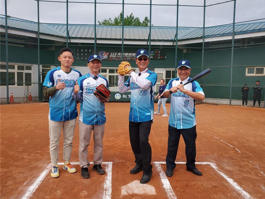 雲科大校長楊能舒(右一)退休前完成整建校內被球場,13日象徵性舉行啟用典禮,投手江國豪(左一)指導教育部次長林騰蛟(右二)投球開球。(周麗蘭攝)