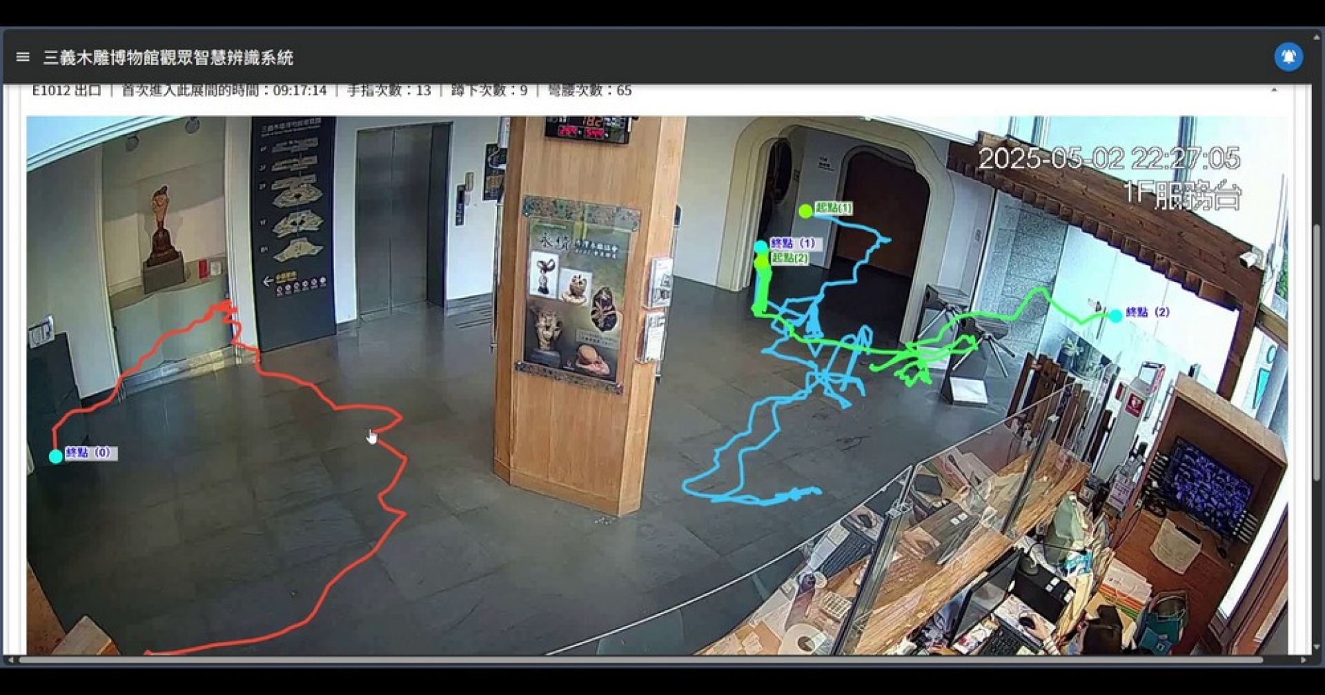 這套系統可精確統計每日入場人次與各展區人流密度、有助於館方即時掌握人潮動態,也能據此調整動線,引導觀眾分流參觀,提升展場的舒適度與安全性;其次透過觀眾群體屬性分析,自動統計年齡層與性別的大致分佈,以了解觀眾輪廓、作為優化展覽規劃的依據。為加強服務品質,這套系統開發特有的「行動輔具識別」功能,可辨識出使用輪椅、拐杖等輔具的觀眾,提示館方即時提供協助;最後是系統的「空間熱點分析及觀展行為模式識別」,能透過AI演算法辨識觀眾在展區內的特定動作,包含「蹲下觀看」、「彎腰靠近」、「手指作品」、「拍照紀錄」肢體辨識,館方可以了解哪些展品最能激起觀眾的興趣,進一步作為展品設計與體驗優化的重要依據,進而呈現展場中「人氣熱點」與「冷區」的分佈情形,協助館方進行空間配置優化,提升整體觀展品質。