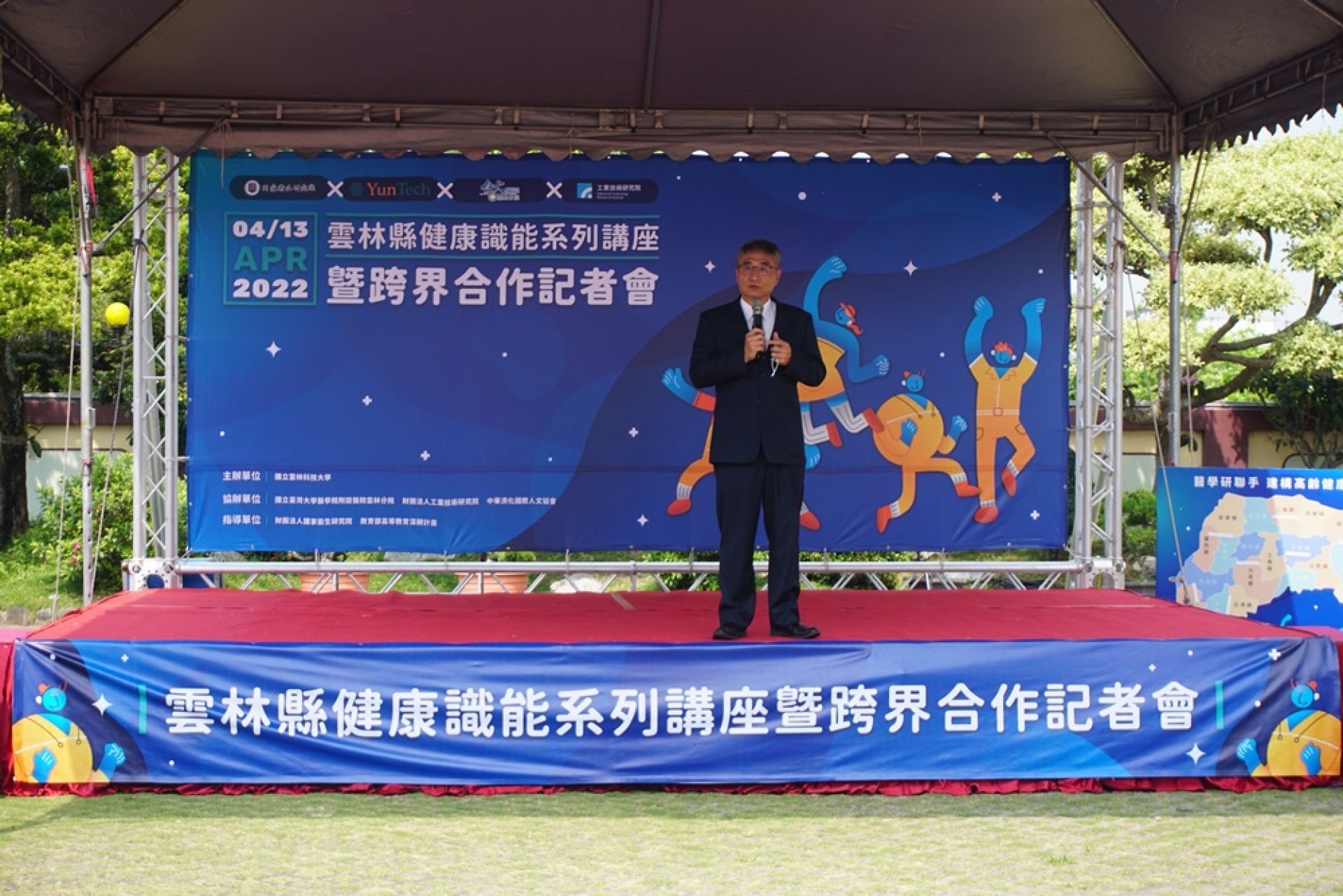 「雲林縣健康識能系列講座暨跨界合作記者會」於4月13日在斗六市濟化宮辦理,由雲科大楊能舒校長、國衛院高齡醫學暨健康福祉研究中心許志成執行長、台大醫院雲林分院黃瑞仁院長、工研院服務系統科技中心張傳育副執行長、行政院雲嘉南區聯合服務中心許根尉執行長等出席為活動揭開序幕。本次活動由台大醫院雲林分院的葉忻瑜醫師主講「肌不可失」,搭配台大醫院雲林分院的許瓊芬物理治療師帶領的樂齡肌力運動,與民眾分享如何強化肌肉、強化樂齡生活就要動!此外,工研院更規劃AI健康科技體驗,現場提供Inbody身體組成分析儀、AI數位眼底攝影機檢測服務,來評估社區參與者的身體肌肉健康及視網膜病變風險,民眾參與十分熱烈。