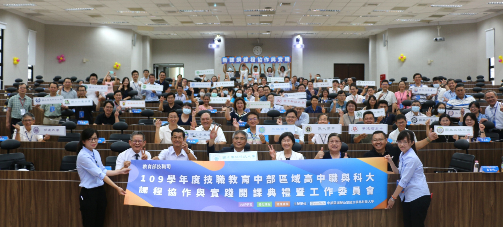 國立雲林科技大學辦理精進技職教育課程分組計畫-中部區域辦公室,調查高中職學校落實新課綱之課程需求,召集臺中市、南投縣、彰化縣、雲林縣、嘉義縣17所高中職、18所科技大學及學者專家、高中職校長、產業代表等6位諮詢委員,於7月7日於雲科大國際會議廳,召開「109學年度技職教育中部區域高中職與科大課程協作與實踐開課典禮暨工作委員會」。期以區域聯盟方式推動發展新課綱實務課程合作與資源共享機制,強化核心技能課程與實務連結,共同發展新型態課程與成立跨校師生學習社群,精進落實新課綱。