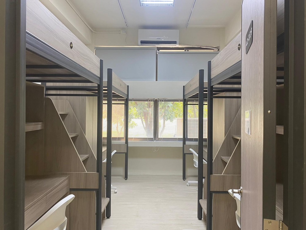 不同以往的是,今年雲科大改建完成的A2棟新式冷氣房開始提供給住宿生使用,每間寢室內皆配備滑動式座椅、各床位都有小夜燈及USB插座在床邊,為了因應手機使用習慣無須下床充電;若同學覺得隱私不足,也可加購床簾使用增加個人空間感。其他房型的學生若要到床上需要經由垂直型爬梯,而新式冷氣房的樓梯幅度設計則可以讓學生更加安全的上下床;浴廁的分離式格局與工業風設計,讓住宿生擁有舒適的衛浴環境。不僅如此,戶廳設計的愜意休閒風讓學生在繁忙的課業中能夠得到身心靈上的放鬆,增加住宿生在戶廳交流聊天與讀書的意願。