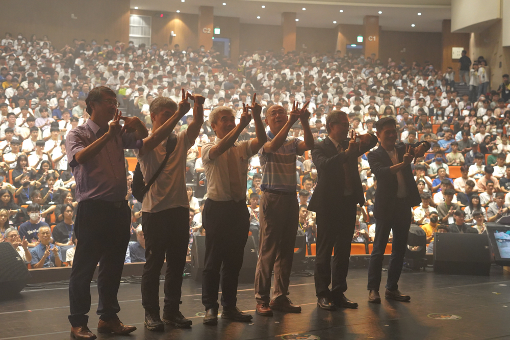 YunTecher集合囉!雲科大新生營開啟大學第一課-方副校長與五位院長手比營隊手勢與全體新生合影