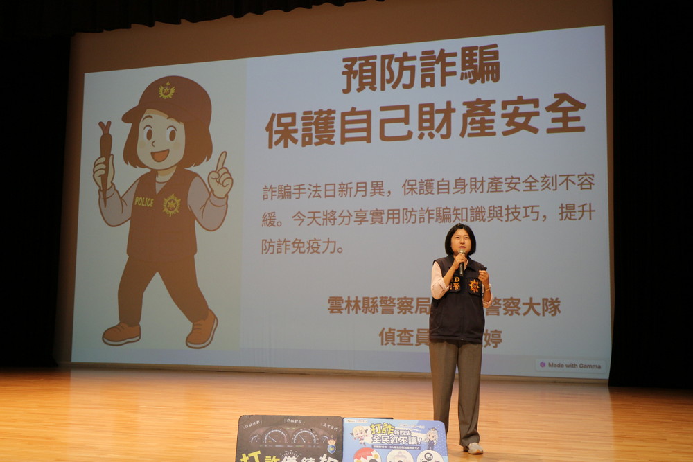 為了提升同學們的犯罪預防知能與自我保護能力,國立雲林科技大學於10月1日大一週會特別邀請 雲林縣警察局刑事警察大隊偵查員張雅婷蒞校演講,主題為「認識七種常見詐騙手法及預防之道」。