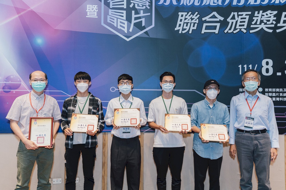「邊緣運算技術應用於智慧化營建工地監控」,獲24屆旺宏金矽獎應用組銅獎,蘇副校長與師生一同領獎