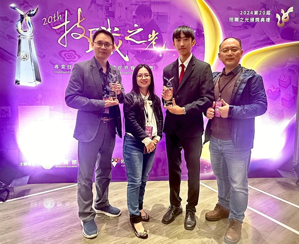 教育部技職司12月20日頒發第20屆「技職之光」,國立雲林科技大學設計學院工業設計系陳渝軒同學榮獲工業設計類競賽之競賽卓越獎,設計學院跨域設計技優班陳聖傑同學及未來學院機器人技優專班柯柏豪同學榮獲技職傑出獎證照達人(技術型高中組)。