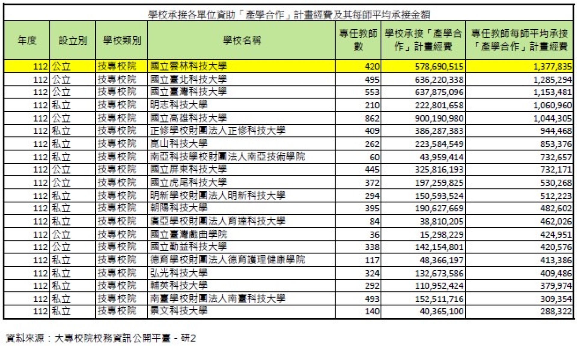 大專校院校務資訊公開平臺113年12月27日公布全國大專校院在校務資訊各面向之統計,國立雲林科技大學112年度師均產學合作金額排名六度蟬聯科技大學第一名,顯示雲科大在鏈結產業需求和研究務實致用的卓越表現。