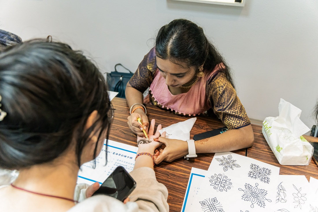 印度學生協助參加者進行曼海蒂彩繪,讓同學透過親身創作感受印度藝術文化的細緻與魅力