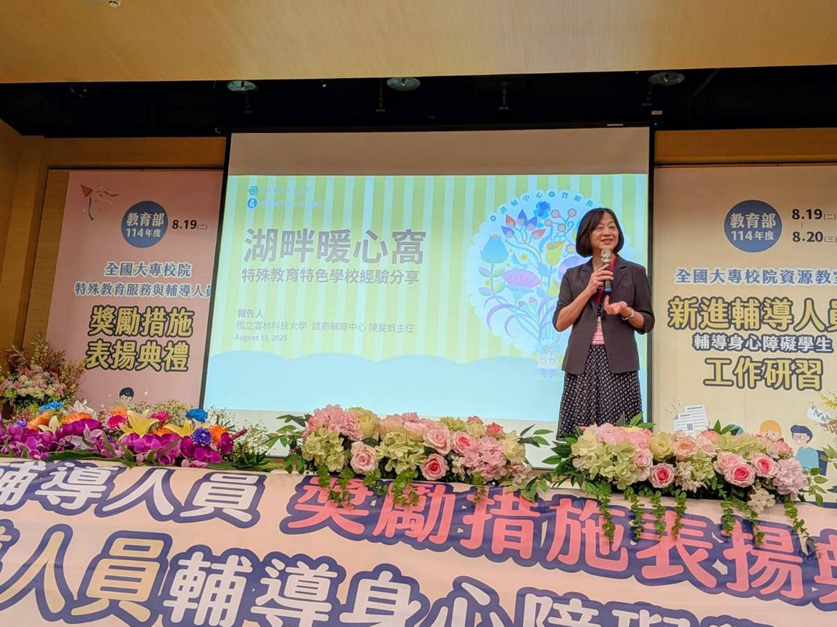 此外,在頒獎典禮中,雲科大諮商輔導中心陳斐娟主任代表校方介紹學校特色,指出「每一次學生的突破與亮點,都是團隊努力的成果,也再次印證特殊教育不僅是輔導,學生在校園的每一次突破與亮點,都充分展現「以生命影響生命」的教育理念,而透過軟硬體改善、心理諮商、跨單位協作及生涯輔導等措施,融合教育得以落實,形塑一個能讓特殊教育學生安心就學、充分發揮潛能的校園。