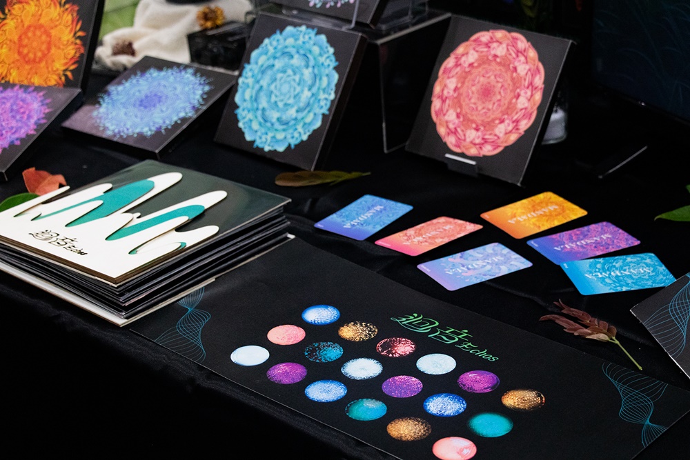 「迴音」:是一個聲音視覺化的實驗作品,運用音流學共振將聲波轉化為水波圖像。以圓形象徵宇宙秩序,結合曼陀羅與自然白噪音,創造視覺與聽覺聯想的圖形符號設計。