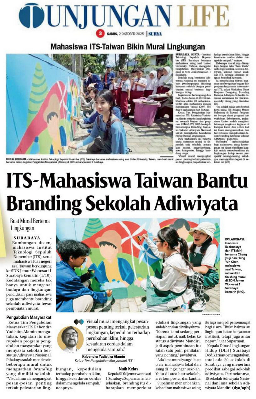 此次活動旨在促進兩校師生之間的文化交流與學術合作,並提升學生的國際視野與專業技能。期間,施文禮老師對泗水理工大學視覺傳達系學生共400位,進行了四場講課活動,內容涵蓋台灣在地王爺信仰的設計轉譯、畢業專題設計的得獎策略,以及與學生共同授課的創意王爺文化交融設計工作坊,獲得該系師生的熱烈迴響與高度評價,雲科大視傳系學生則參與當地模範小學的校園大型壁畫工作坊,獲得印尼當地多家媒體採訪與報導。