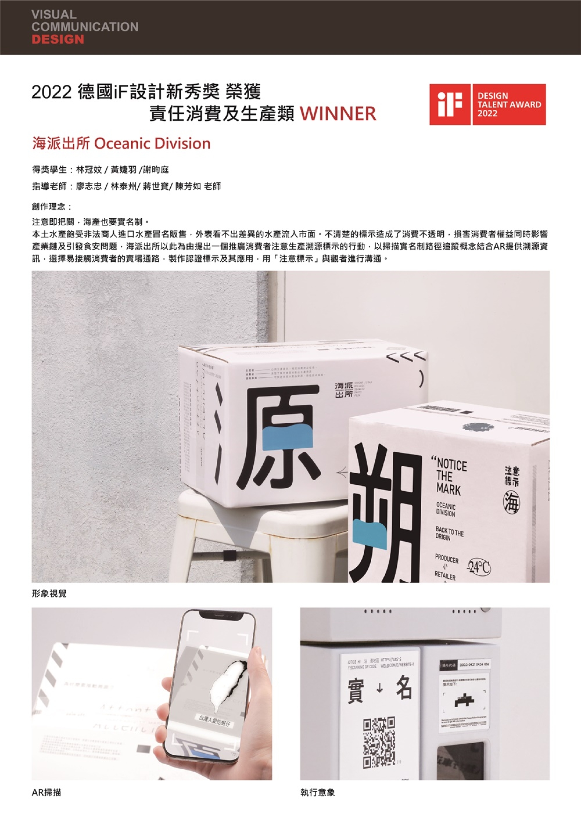 德國iF設計獎近日公布2022年iF設計新秀獎獲獎名單,雲科大有2件作品獲獎。得獎作品分別為:視傳系廖志忠、林泰州、蔣世寶、陳芳如老師所指導之林冠妏、黃婕羽、謝昀庭同學-「海派出所Oceanic Division」。視傳系趙飛帆、曹融、林加雯、施文禮老師所指導之麻家綺、趙淑貞、王博毅同學-「囀機 Planes Of Taiwan Exotic Birds」。