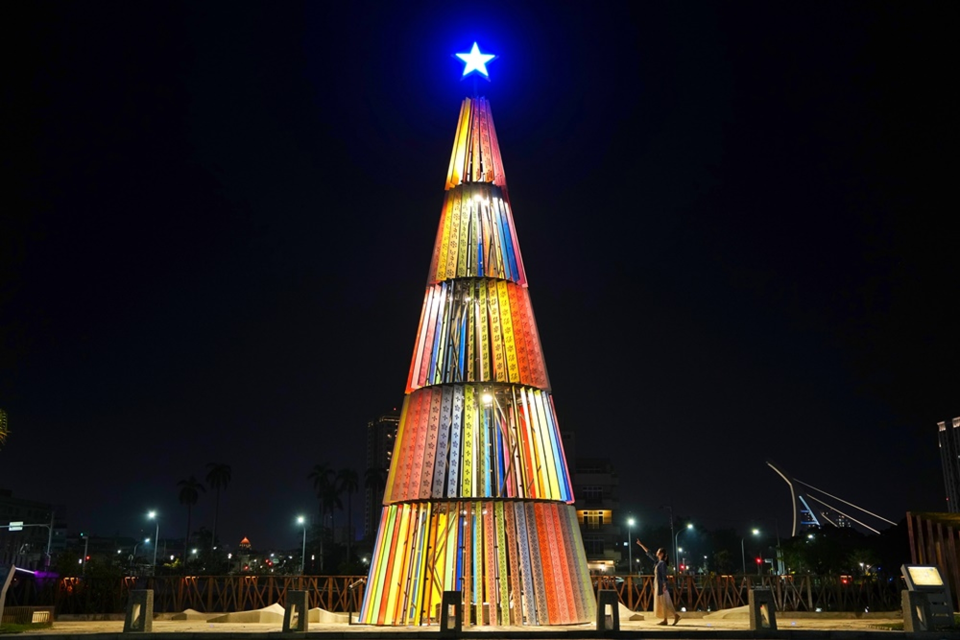 在年終接近時刻的12月,台南市著名景點河樂廣場,為觀旅局規劃的大型聖誕樹造形地景系列活動,由雲科大視傳系黃雅玲教授團隊設計製作,於美麗的運河畔旁矗立當中。本次「點一盞報平安-平安的問候」聖誕樹視覺表現,有別於過去兩年五角形的造形,是以傳統聖誕樹的圓錐型為主要結構,呼應人們對於自然仿生造形的連結。同時為呼應主題概念,加入傳統聖誕節點燈儀式來強化佳節閃亮光明的意象。其中色彩設計主要透過一體雙面的部件,塗佈一側反光銀色、另一側則透過多樣色系,運用在聖誕樹雙層結構的層次表現,經由觀者視點移動形成色彩動態的變化效果,讓此座高達15公尺的聖誕樹,在河畔倒影中因為環境態勢而彰顯其動感效果。
