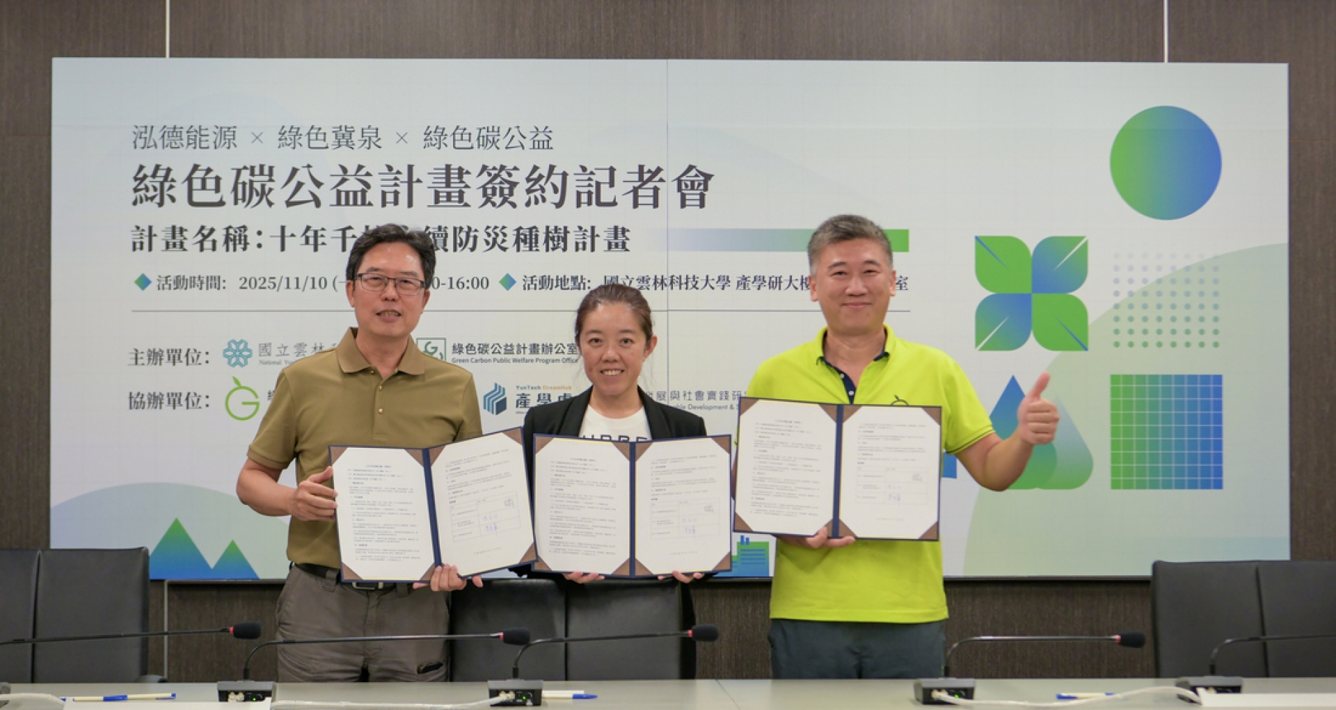 為響應全球淨零碳排與氣候行動目標,並推動永續教育向下扎根,泓德能源科技股份有限公司、雲林科技大學綠色碳公益計畫辦公室與綠色冀泉社會企業共同宣布啟動「十年千校永續防災種樹計畫」。三方於11月10日舉行合作簽約記者會,雲科大產學處、永續發展與社會實踐研究中心、禾豐碳中和、SNN 環宇鋼鐵網等貴賓共同見證,正式宣告這項公益活動正式啟動,共同攜手推動校園防災綠化、碳權管理與環境教育的長期行動。