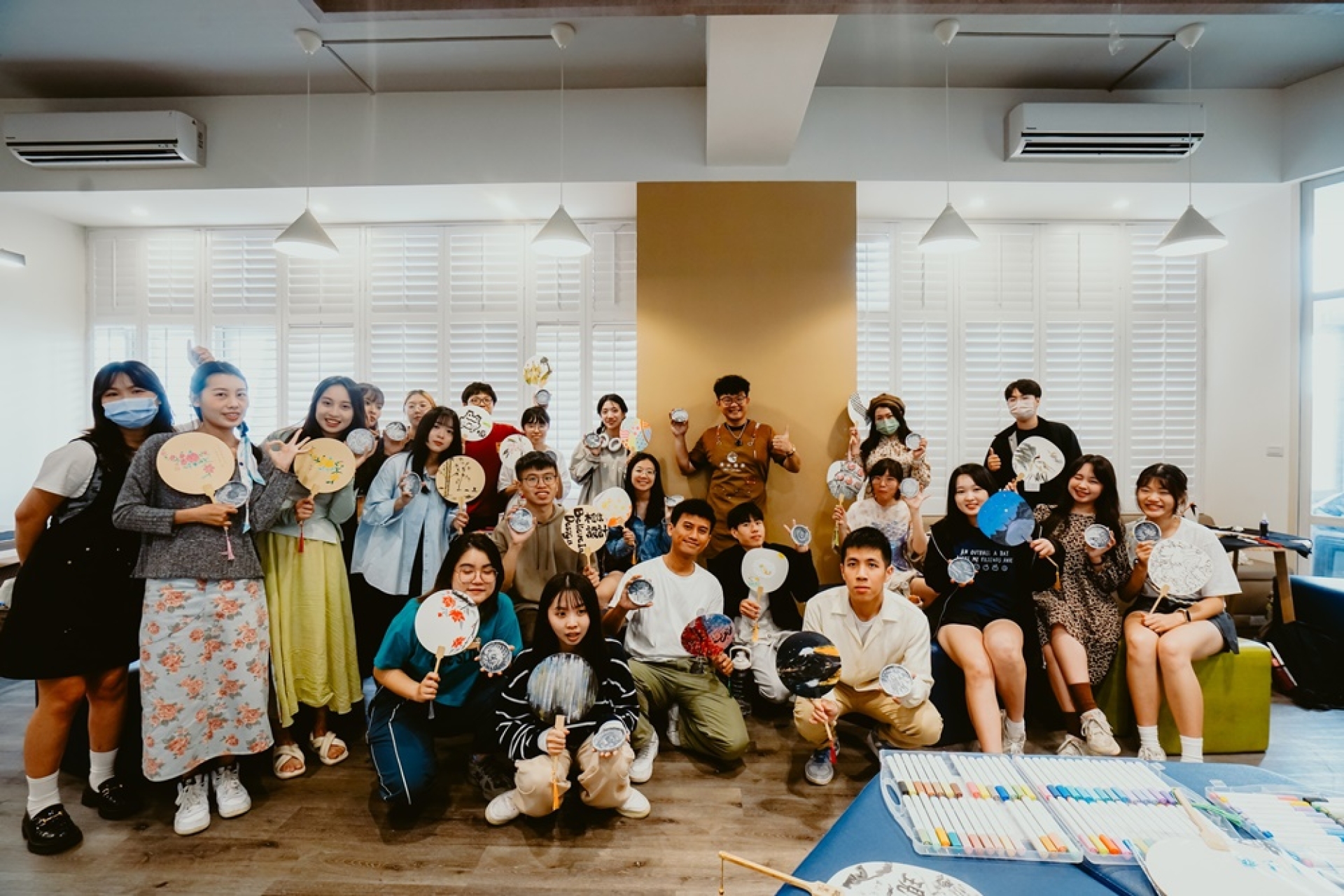 「淺山植藝×永續設計國際工作坊」參與者展示個人「榔炭杯墊」與「手工彩繪扇」作品