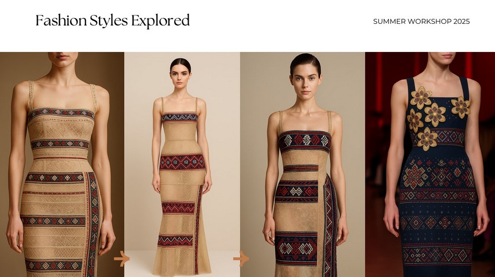 營隊聚焦AI在圖騰與服裝設計中的應用,包含圖騰數位化與資料庫建構、生成式設計、個性化時尚開發及虛擬試穿技術。團隊運用生成式AI(如Midjourney、DALL·E)重塑南島語族的傳統圖騰,融合當代表現語彙,打造具有文化深度與市場潛力的設計成果。AI亦應用於圖紋生成、布料裁切與排版,協助降低生產廢料並提升永續效益,設計元素涵蓋猴、鹿、龍、太陽、星與幾何紋等圖騰符號,象徵自然崇拜與部族認同。透過AI再設計,這些文化符號展現出兼具民族特色與現代美感的時尚語言,推動傳統與科技、文化與創新的深度融合。