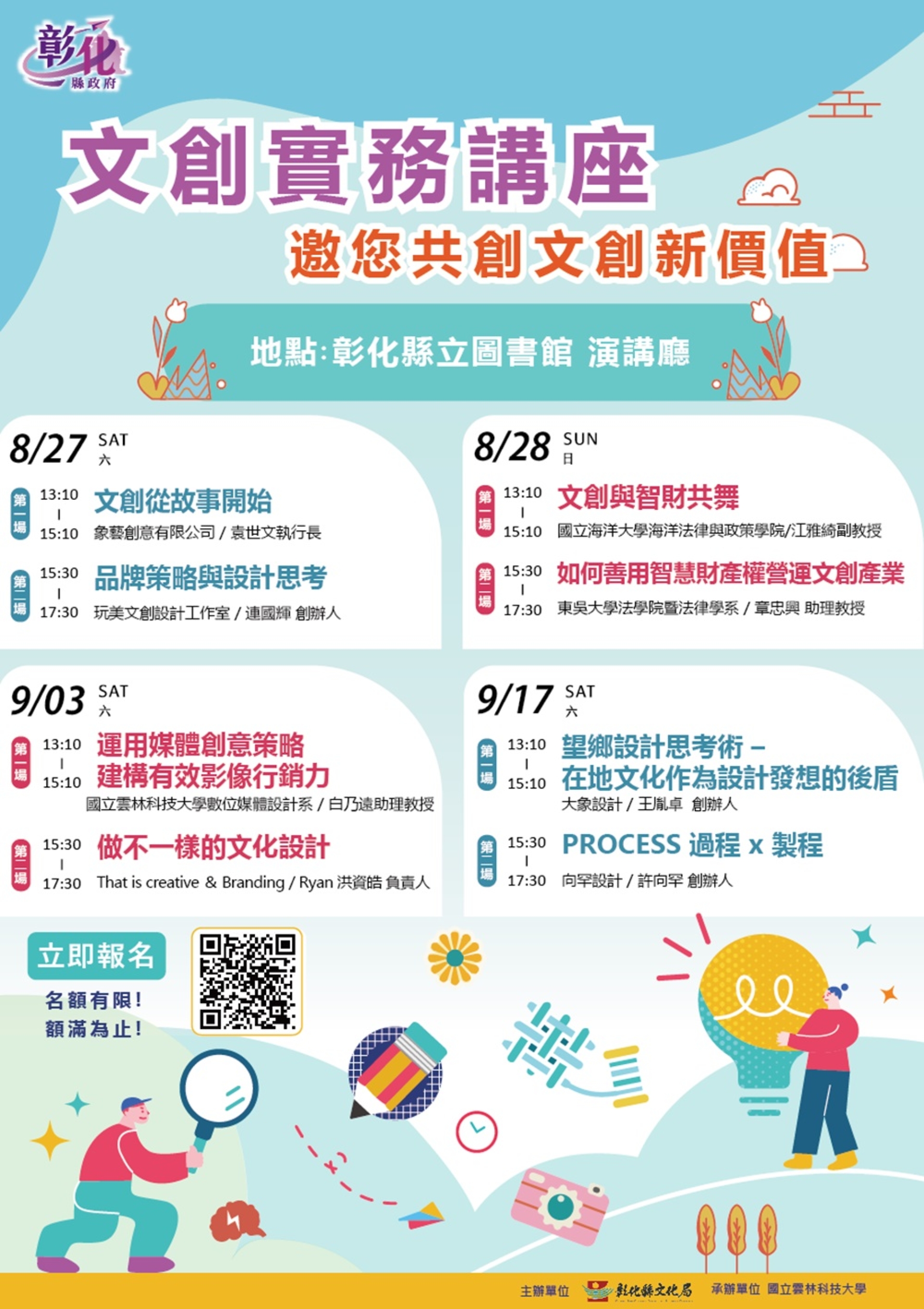 國立雲林科技大學承辦彰化縣文化局2022年彰化縣文創輔導暨培力育成計畫委託案,於8月27日起連續舉辦8場「文創實務講座」,協助業者建立文創完善知識體系,提昇市場競爭能量。