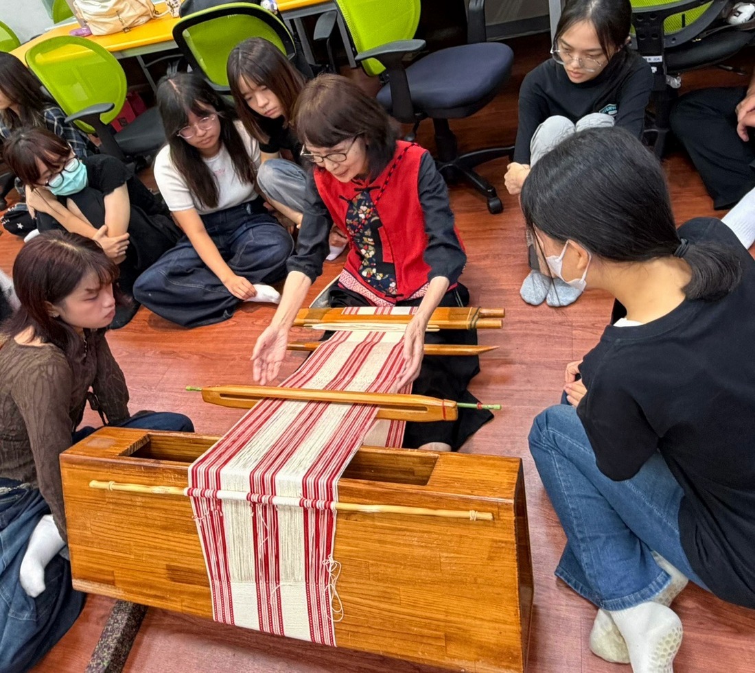 這一階段的課程亮點豐富,包含臺灣多元工藝文化的深度探索:首先是原民文化傳承,邀請文化部重要傳統工藝「賽德克族Gaya tminun傳統織布」保存者—人間國寶張鳳英(Seta Bakan)藝師,於10月20日親授織布工作坊。張藝師介紹了賽德克族的織布、服飾文化與三代織女傳承歷程,並指導學員運用地織機的平織基礎技法。在實作中,許多非文資科系的學生,甚至男性學員也踴躍參與並展現高度興趣,最終人人欣喜地帶走自己的第一塊手織布,體現了文化傳承打破傳統性別限制的當代意義。