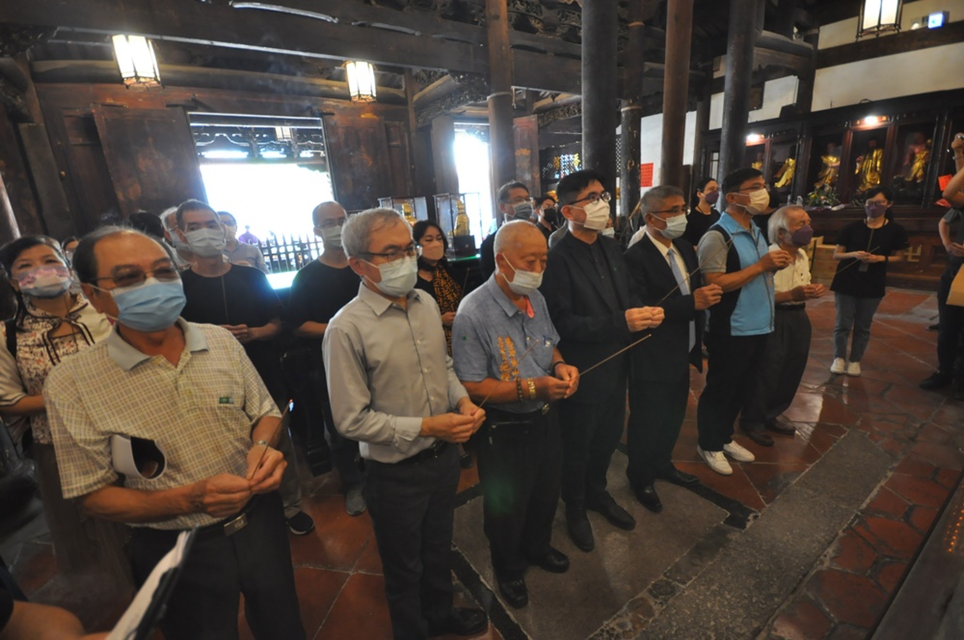 文化部陳登欽主任秘書(中)與鹿港龍山寺主任委員施輝雄(左三)帶領與會貴賓,於說明會前進行祭祀典禮,以求計畫順利執行。