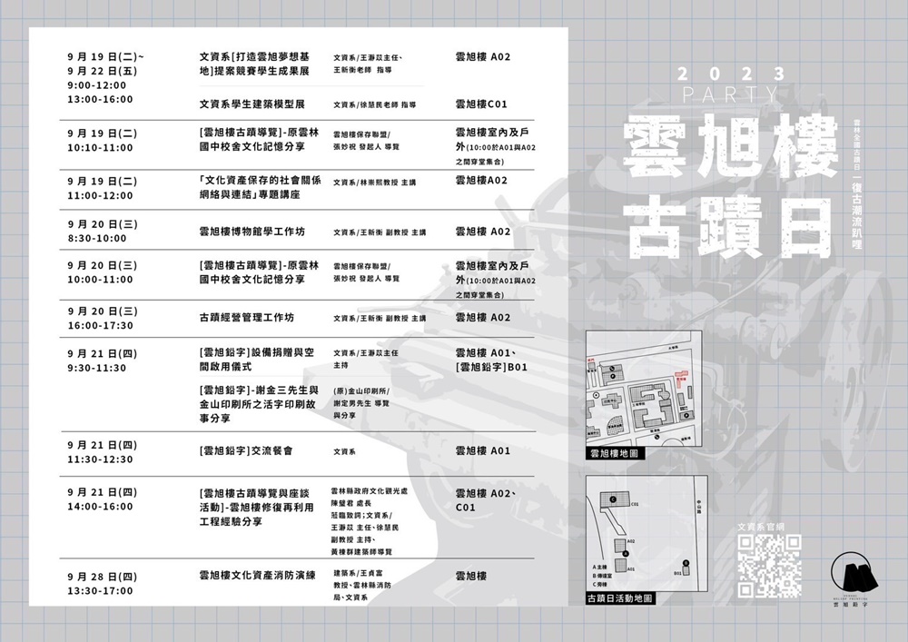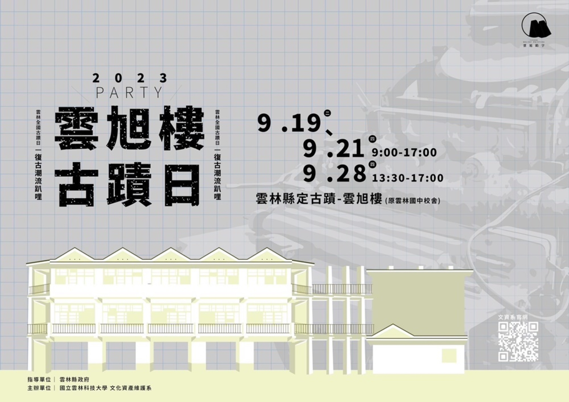 2023年全國古蹟日活動,於本週在各縣市紛紛熱鬧登場,國立雲林科技大學文化資產維護系發揮本身學術與實務並重的專業,配合活化雲林縣縣定古蹟雲旭樓空間的機會,辦理多場精彩展覽與工作坊。其中,將在9月21日特別策劃了一場在故紙堆中,重現往日風華的鉛字活版印刷設備捐贈儀式暨「印刷科技物件展」。