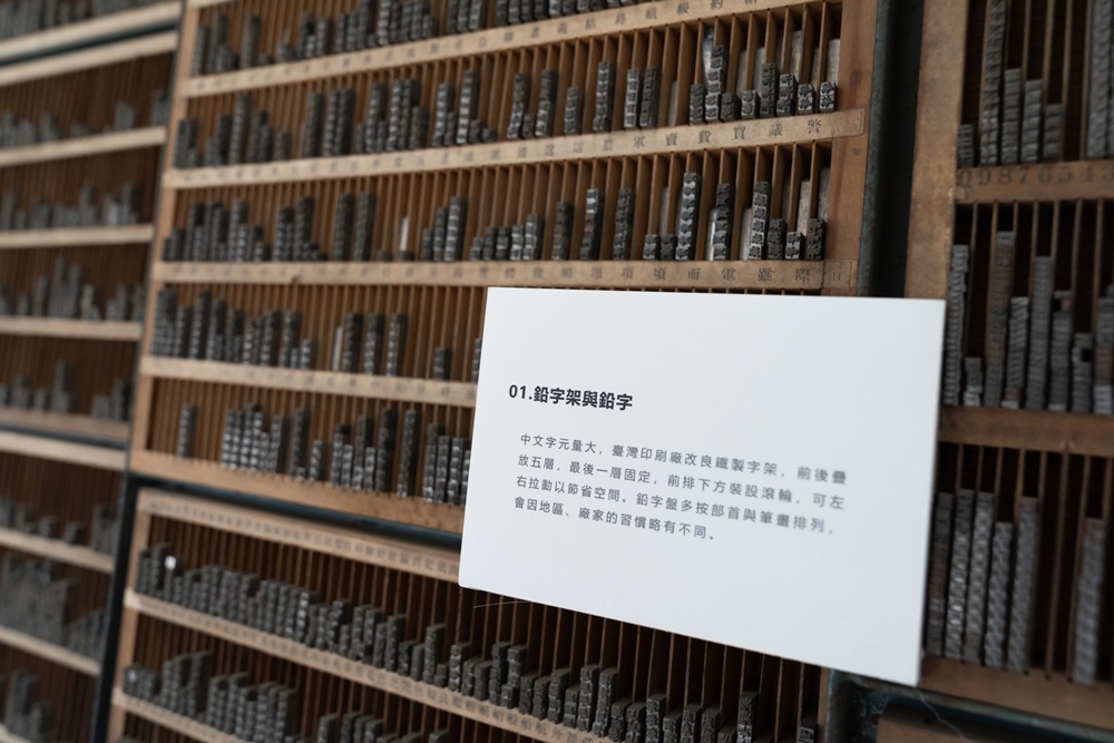 展場內最能吸引目光的,當屬前後疊放共計五層,底下安裝軌道滑輪的大型鉛字架,以及鉛字架上密密麻麻,已經「洗盡鉛華」的上萬枚鉛字。其次,可以見到謝先生承印過的各式名片、請柬、喜帖、學校表單、學生手冊樣本或成品,以及當年使用的工作桌、角鋼架、排版材料盤、檢字盒、組版盤、墨刀、棉線、木製行條、空鉛、流水號碼機等等活版印刷工具。再者,則是一部電動圓盤印刷機,適用於印製尺寸較小、印量較少的物件。展場內的另一項重要文物,乃是大正五年(1916)出廠,謝先生於1987年購入的平臺式印刷機(活版車),可以印製大尺寸物件,並搭配號碼機印製標示流水號的表單。這部超過百年的印刷機,通電後仍可正常運作,如今靜止的機臺上仍有未印製完成的半成品,彷彿將活版印刷產業曾經輝煌的時光,凍結在那一瞬間。