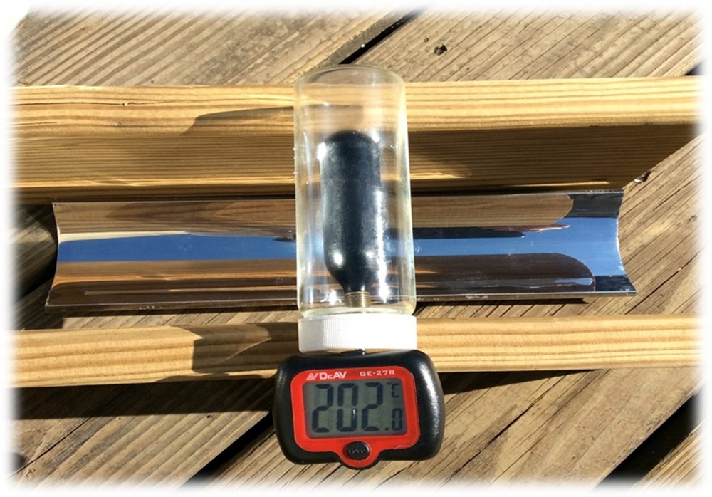 加熱脫附再生冷媒實際圖。利用太陽能集熱管15分鐘即可到達200度以上的集熱效果