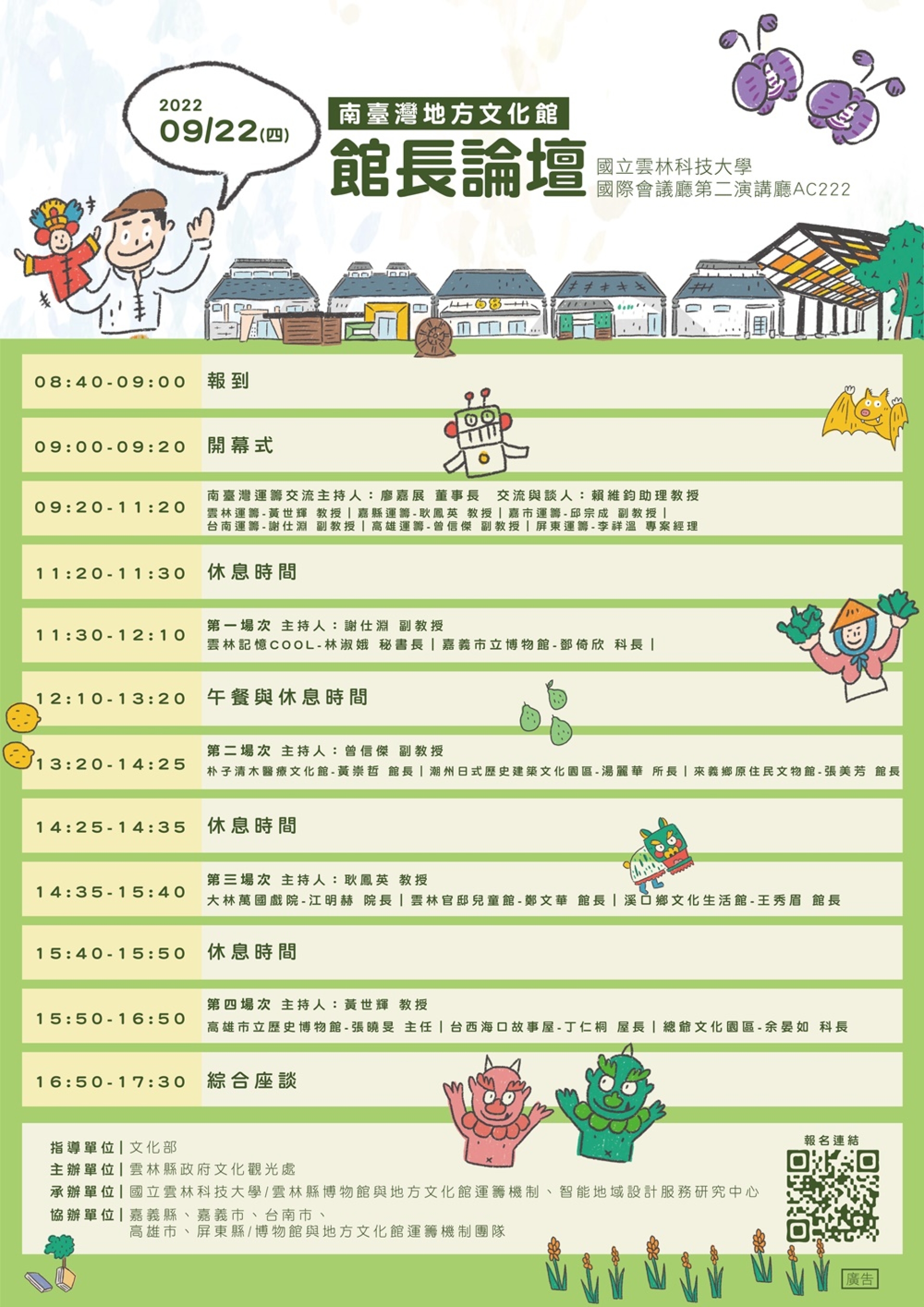 為促進跨縣市地方文化館及博物館的交流,國立雲林科技大學將於9月22日舉辦「2022南臺灣地方文化館 館長論壇」,邀請雲林、嘉義縣市、台南、高雄及屏東等共六縣市之運籌團隊與文化館舍館長,進行發表及交流,同時也邀請先進專家共同討論與對話。