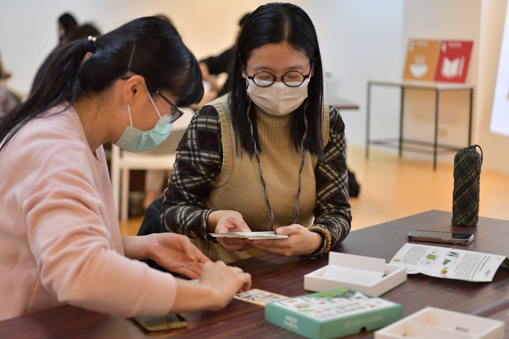 11日下午舉辦教師增能研習工作坊,運用學校自行開發,透過圖像刺激啟發與糧食危機議題的永續教具桌遊《綠色饗宴-責任消費之旅》、讓玩家們可以透過友善環境、綠色行動、智慧科技的好點子共同腦力激盪,思考如何在2030年前達到「SDG 2:終結飢餓」與「SDG 12:責任消費與生產」的全球永續發展目標,探討造成糧食危機的因素(全球極端氣候肆虐、地緣戰爭、飢荒、食安、農災、食物過剩、通貨膨脹、農糧出口受阻)以及發想因應調適之道。同時協助參與教師們集思廣益、產出SDGs導入課程的教學方案,引領教師共創10種牌卡教學使用場景,建立教學方法創新的想像並與跨領域教師一同交流教學方法,藉此提高學生學習動機。