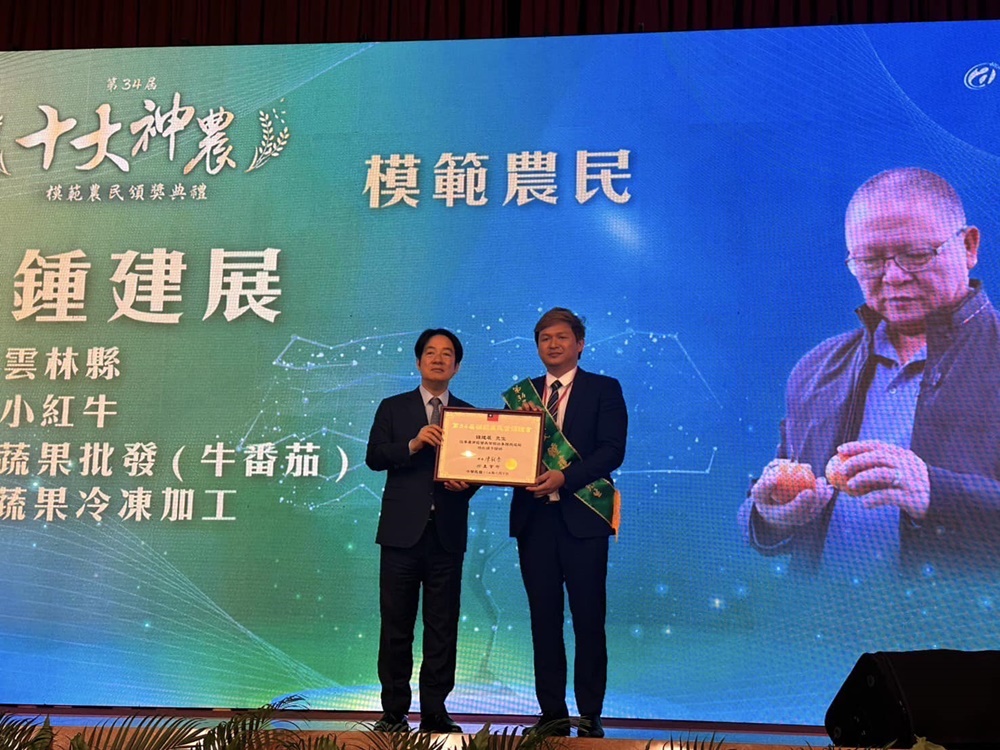 本次典禮由總統親自出席,表揚在智慧農業、環境友善及食品安全等領域表現卓越的得獎者。展鮮農產生技股份有限公司的鍾建展先生,長期致力於牛番茄產業的發展,透過契作模式集結超過百位農民,並導入IQF急速冷凍技術與HPP高壓冷殺菌技術,不僅有效解決農產過剩問題,還成功推出如梅蜜番茄飲等創新產品,外銷至東南亞,為臺灣農業開創國際市場。