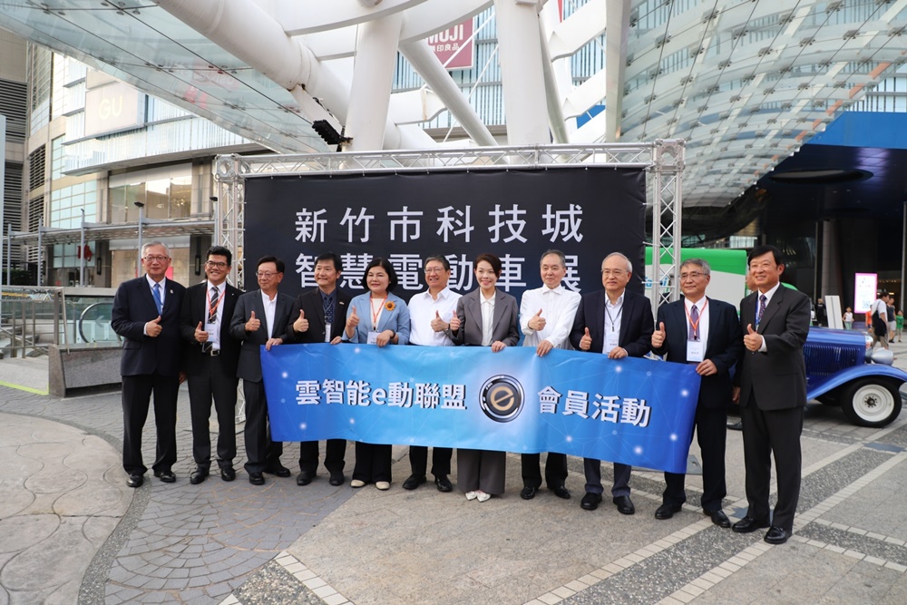 宣明智董事長、交通部祈文中次長、高虹安市長、楊文科縣長、張麗善縣長參觀電動車合照