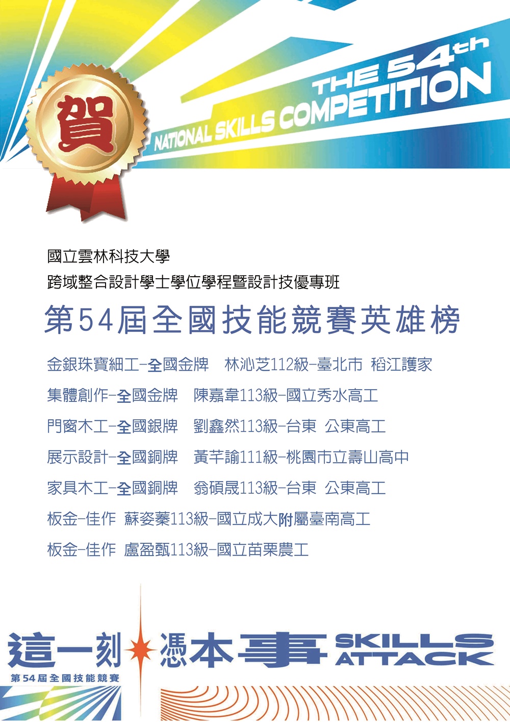 第54屆全國技能競賽圓滿落幕,雲林科技大學跨域整合設計學士學位學程暨設計技優專班的學生們在此次全國技能競賽中表現出色,多位即將進入學程暨專班就讀的大一新生也表現亮眼,共獲得2金牌、1銀牌、2銅牌及2佳作的優異成績,再次展現了傳承與卓越的技職精神,為學校爭光。