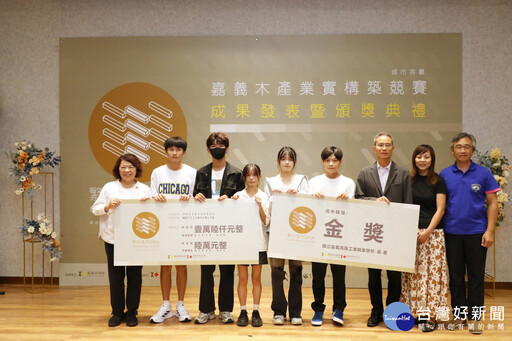 本次競賽共11所大專院校、18件作品和10所高中職、22件作品參賽,經過激烈競爭後各有五組作品進入決賽,本月7日至9日在文化局廣場搭建實體作品,最終大專組由成功大學「木木織亭」拿下金獎,高中、職組由嘉義高工「嘉。室」榮獲金獎殊榮。今(15)日市長黃敏惠與文化局長謝育哲、林業及自然保育署嘉義分署副分署長李定忠、日台交流協會高雄事務所所長奧正史、雲林科技大學教務長李傳房等到場並頒發各獎項獎狀及獎金。