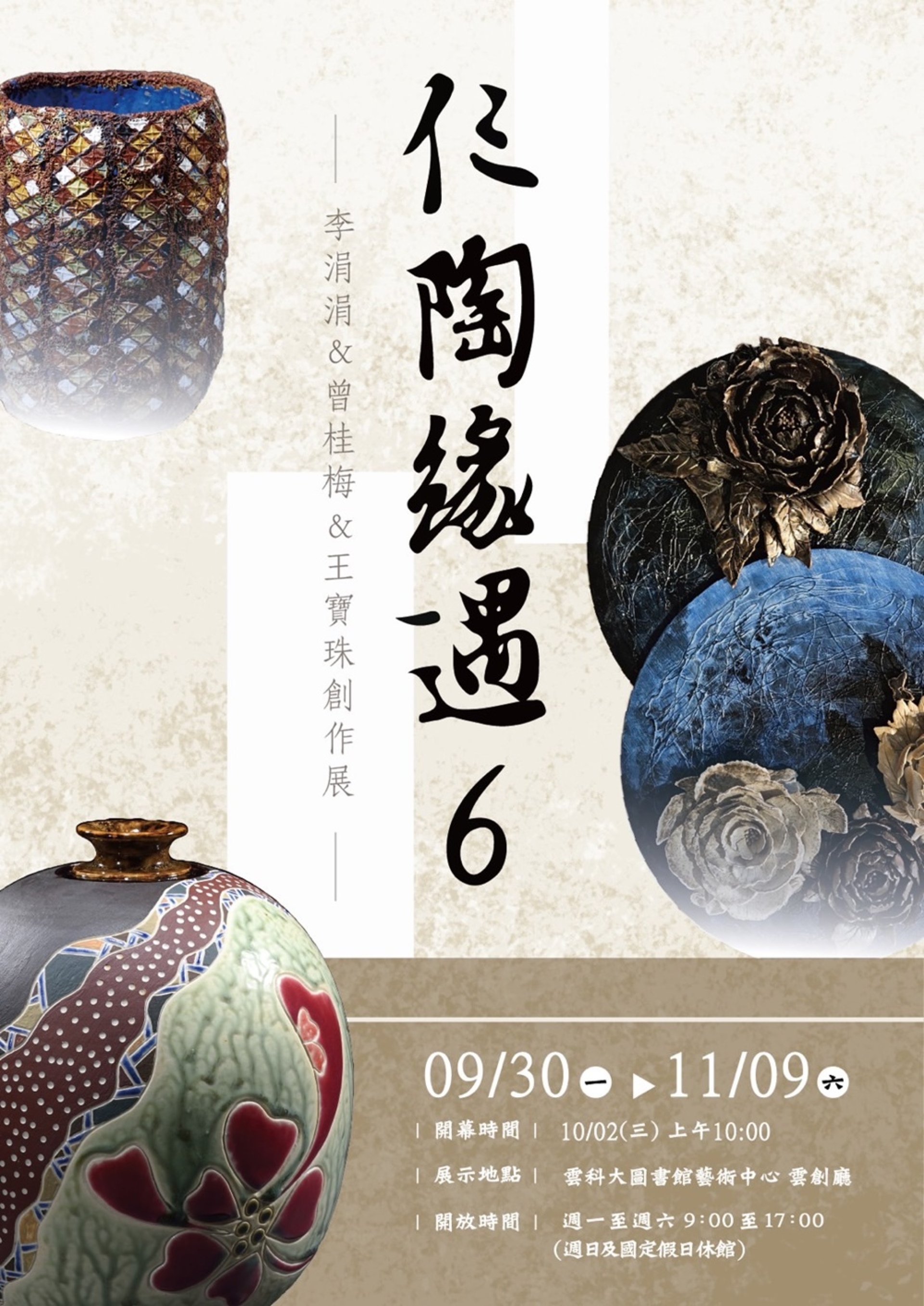 國立雲林科技大學圖書館藝術中心於9月30日(一)至11月09日(六),舉辦「仨陶緣遇6-李涓涓&曾桂梅&王寶珠創作展」,並於10月02日(三)上午10時舉行開幕茶會。誠摯邀請各界人士及陶藝愛好者共襄盛舉。