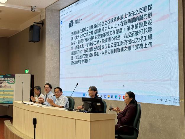 活動邀請中央警察大學許絲捷助理教授進行專題演講「刑事法遵的比較分析-以德國為借鑑」,許教授指出透過採購廉政平台,更多的溝通可協助重大工程的三方更靠近法遵制度,避免違反錯綜複雜的相關規定。接續進行採購平台與廉政法遵座談會,主持人邢啓春處長邀請雲林縣交通工務局廖政彥副局長、雲林地檢署朱啟仁主任檢察官、雲林科技大學科技法律所惲純良所長及專題講座許絲捷助理教授,共同探討履約過程之停工展延、提升行政透明、採購法上的利衝迴避及追求金質獎等議題,透過座談會方式讓與會人員藉由交流更加了解採購履約及平臺之重要性。