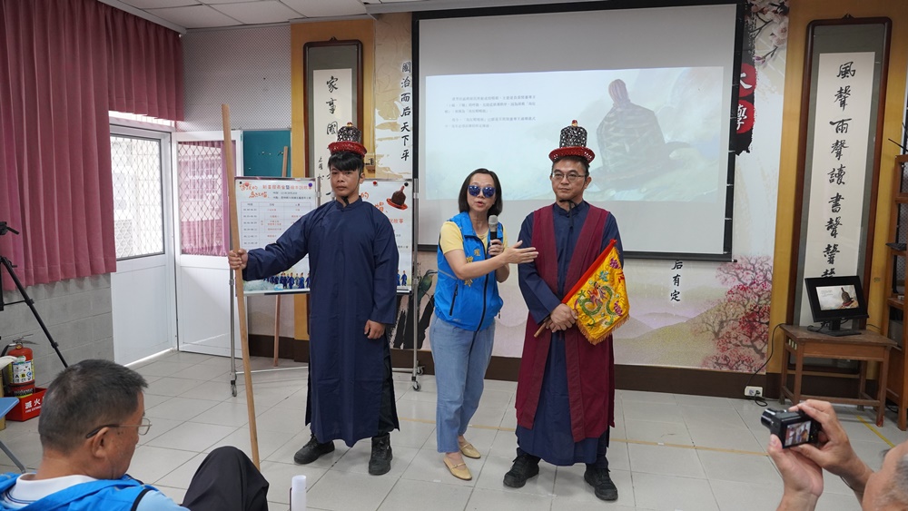 中華五股開臺尊王協會曾美玲總幹事向學童介紹烏紅帽唱班成員之配備