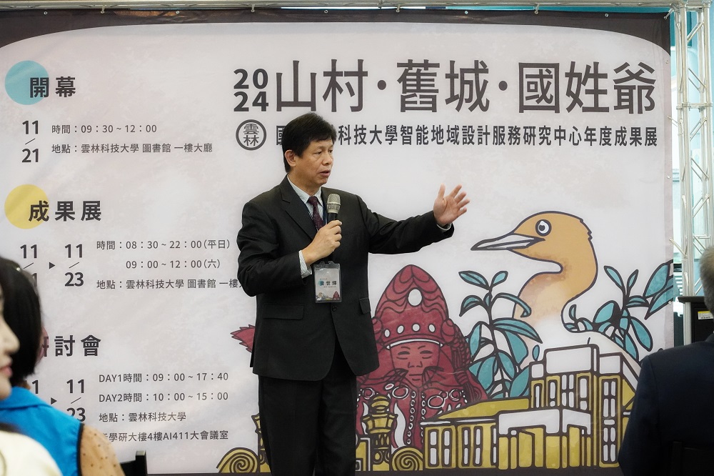 國立雲林科技大學智能地域設計服務研究中心(以下簡稱智能地域中心)11月21日在該校圖書館一樓雲薈廳舉辦「山村‧舊城‧國姓爺」年度成果展開幕式,特別邀請楊能舒校長與雲林縣政府文化觀光處陳璧君處長親臨致詞,由計畫主持人黃世輝教授介紹與會貴賓,為此屆成果展揭開序幕;接著由中華民俗藝術基金會林明德董事長進行專題演講。現場展現「樟湖社區」、「斗六舊城」與「五股開臺尊王」等三大研究場域所執行的各項子計畫成果,以及該中心的國際交流事項,呈現臺日兩地之大學、地域、社區的多邊交流。