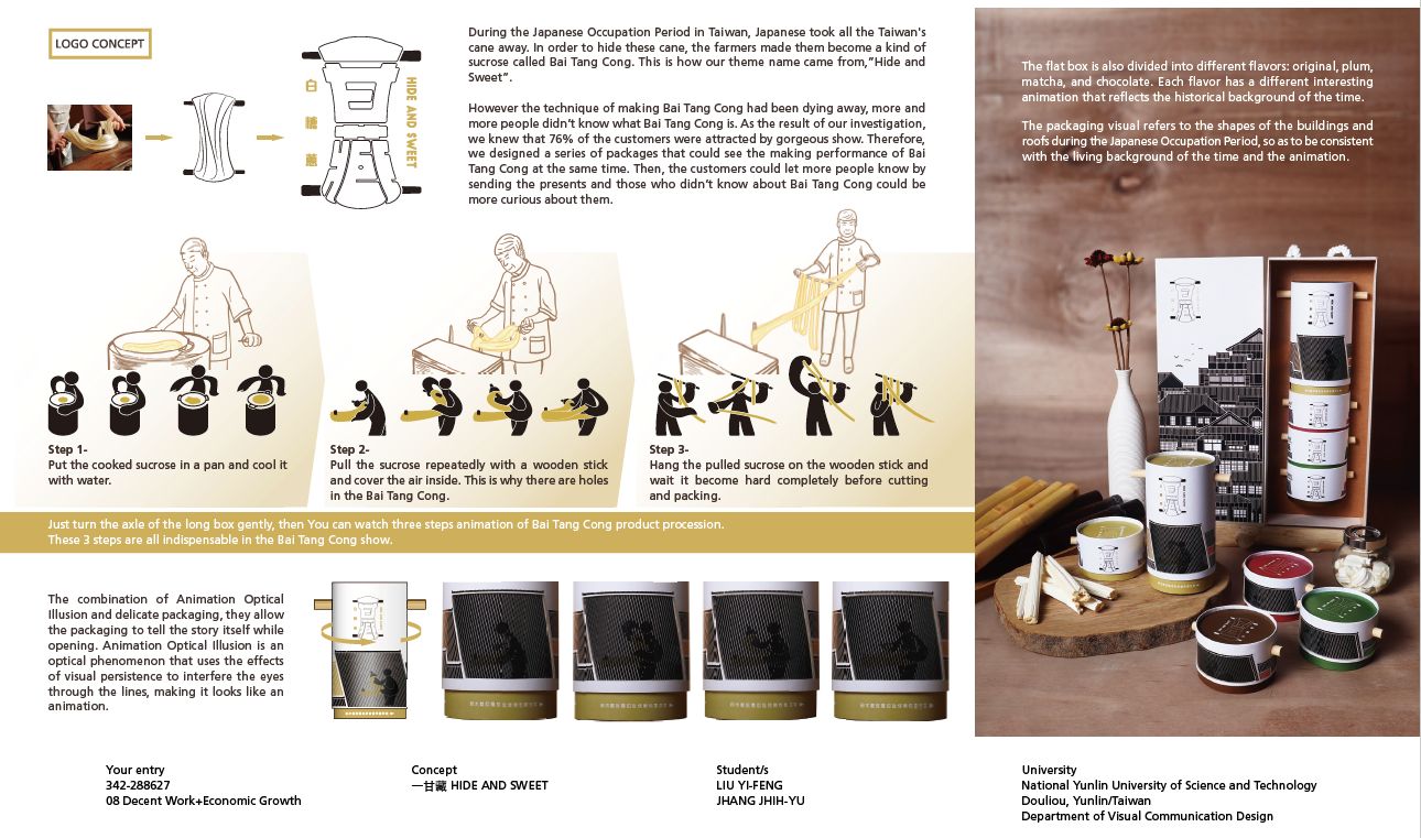 視傳系「一甘藏」的作品:發想來自於日據時期日本將臺灣甘蔗視為珍寶,全部運回日本。蔗農為了將糖留在臺灣,於是將蔗糖做成糖蔥,躲避日本人查收,這就是「一甘藏」命名由來。製作糖蔥之方式不僅是珍貴民俗技藝亦是精彩表演。於是將包裝與光柵結合,打開包裝的同時,就能看到糖蔥製作過程,讓包裝自己說故事。