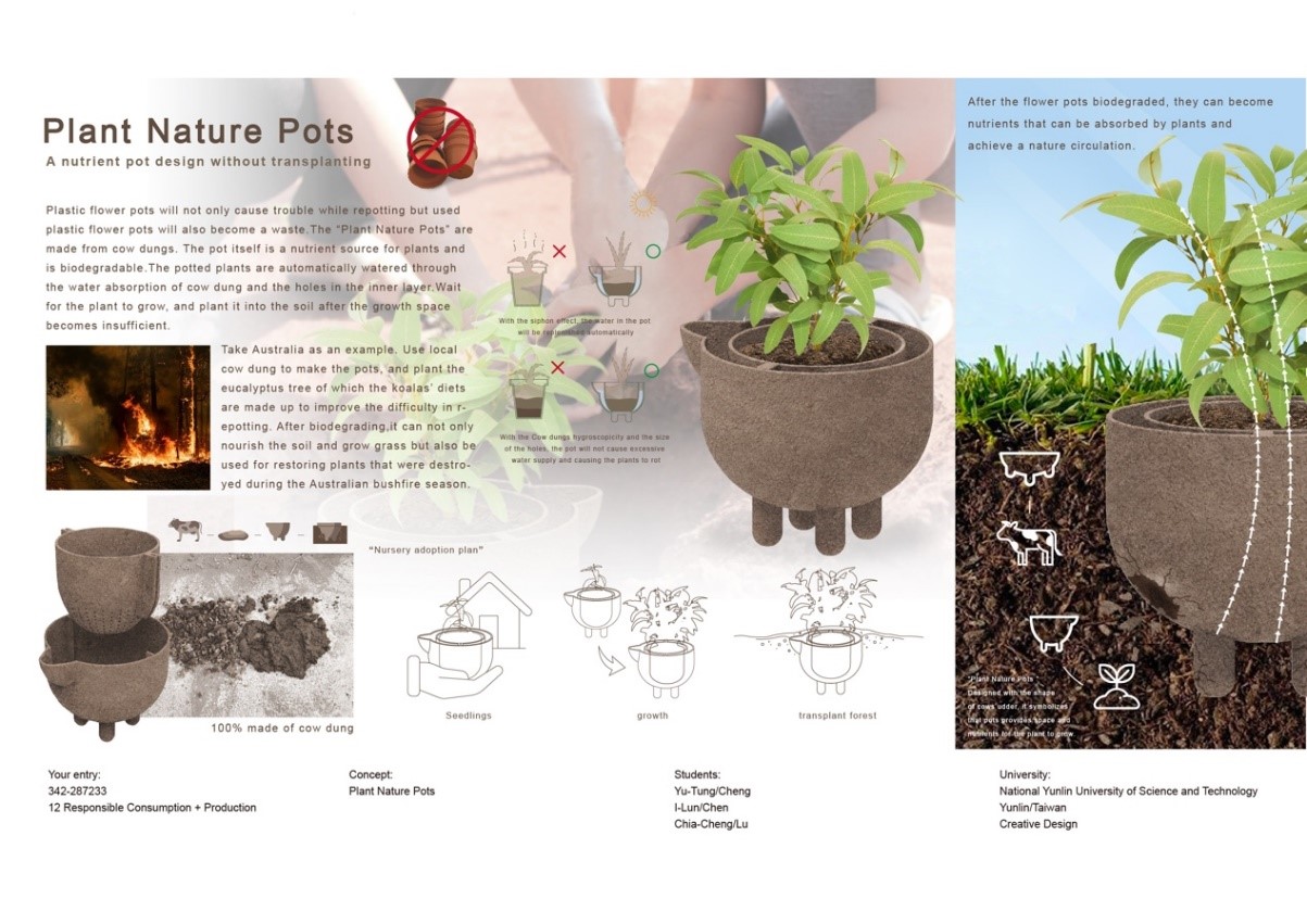 創設系「哞哞盆 Plant Nature Pots-可分解盆栽設計」的作品:覺得塑膠盆栽移盆時不僅造成麻煩,移盆後的塑膠盆栽亦造成浪費。用牛糞製成哞哞盆,盆栽即是植物養分來源,是一個能被分解的盆栽,並以牛乳頭的造型做為設計,象徵哞哞盆提供植物生長的空間及養分。
