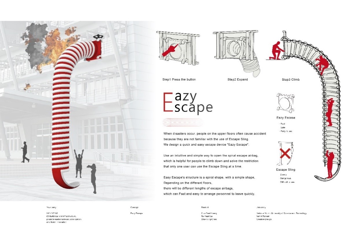 設計技優領航專班「Easy Escape」的作品:靈感來自災難發生時,高樓層的人們常常因為不熟悉緩降機的使用方式,而導致悲劇的發生。因此設計出一款快速簡單的逃生裝置"Eazy Escape",以直接、簡單的方式,開啟螺旋狀的逃生氣囊,利於人們爬下,解決緩降機一次只能一位使用者的限制,外型以螺旋為結構,造型簡潔,快速以及簡單能迅速安排人員疏散。